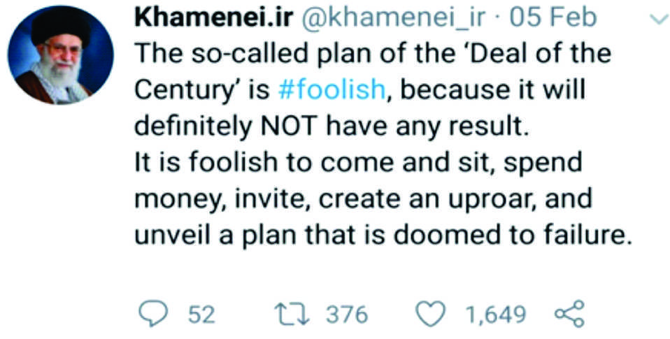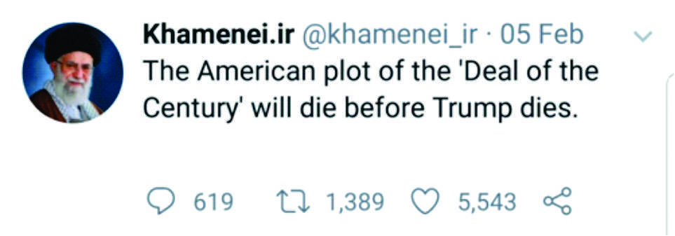 The Iranian Supreme leader is also commenting on the “deal of the century, using twitter.