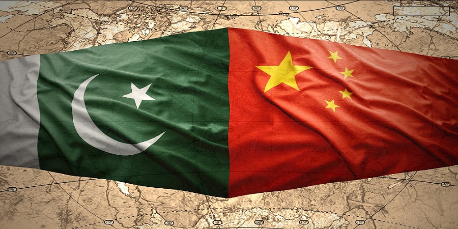 Waving Pakistani and Chinese flags on the of the political map of the world
